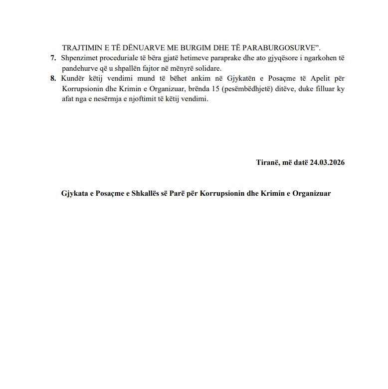 Për të njëjtën ngjarje vijon gjykimi në një proces të ndarë për Dritan Rexhepin, Korado Gështenja, Martin Bleta, Gentian Funiqi, Geraldo Martini, Aldo Majnishta dhe Artan Doçi.