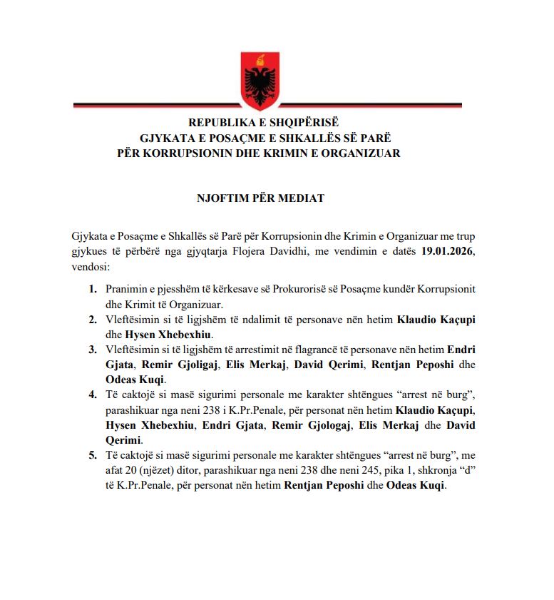 TIRANË- GJKKO ka lënë në fuqi masat arrest me burg për 8 anëtarët e rrjetit të mashtrimit me Call Center, të cilët dolën sot para Gjykatës së Posaçme për t'u njohur me masat e sigurisë. Nga gjykata është lënë në fuqi masa arrest me burg për Remir Gjoligaj, Endri Gjata, David Qerimi, Elis Merkaj, Hysen Xhepexhiu, Klaudio Kaçupi, ndërsa për dy punonjësit Rentjan Peposhi dhe Odeas Kuqi u caktua arrest me burg me afat 20 ditë.