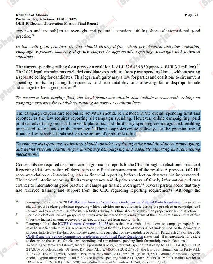 Këto boshllëqe krijojnë shtigje për përdorimin potencial të fondeve të paligjshme dhe të pagjurmueshme dhe anashkalimin e rregullave në fuqi. Për të rritur transparencën, autoritetet duhet të marrin në konsideratë rregullimin e fushatave online dhe të palëve të treta, dhe të përcaktojnë kushtet përkatëse për fushatat e palëve të treta dhe mekanizmat e duhur të raportimit dhe sanksionimit”, - thotë ndër të tjera Raporti për këtë çështje.