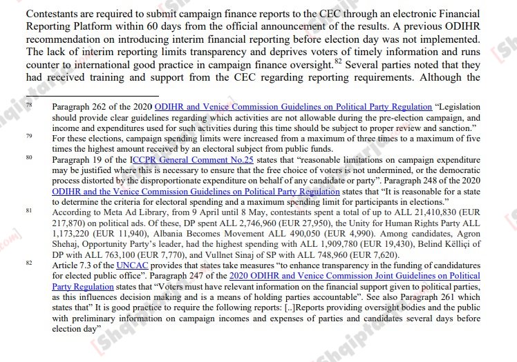 Monitoruesit e ODIHR kanë matur paratë e dhëna duke përdorur librarinë zyrtare të Kompanisë Meta, që bën transparencë për sponsorizimet, pra, shpërndarjen me pagesë të materialeve me përmbajtje propagandistike. Konkretisht, në raport thuhet: