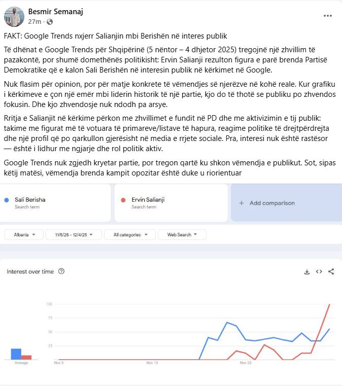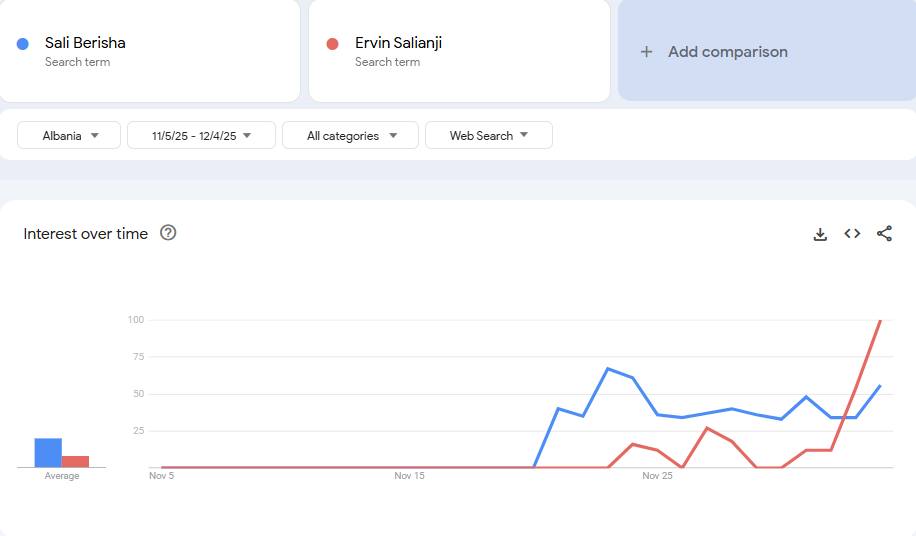 Të dhënat e Google Trends, të publikuara nga eksperti i IT-së Besmir Semanaj, tregojnë se nga data 5 nëntor- 4 dhjetor, qytetarët kanë shfaqur interes më të madh për të kërkuar Salianjin sesa vetë kreun e partisë. Për më tepër, kjo rritje e interesit e bën Salianjin figurën e parë brenda kësaj partie që tejkalon liderin e saj në kërkime.