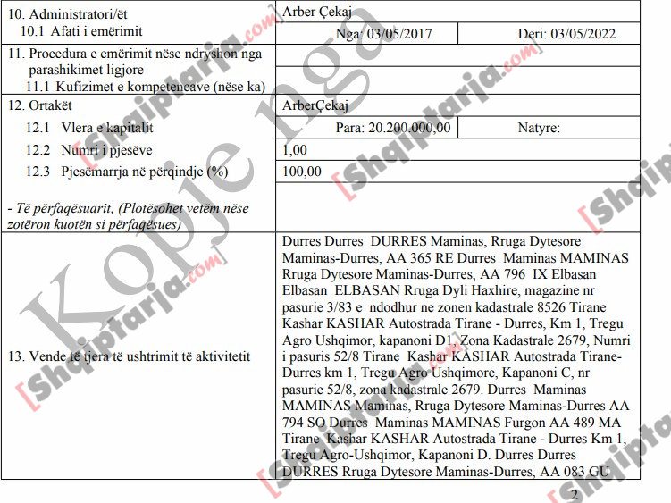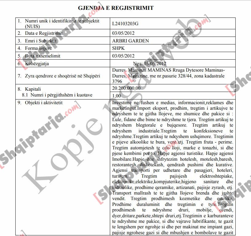 Report Tv mëson se kontenieri me banane nga Kolumbia ishte porositur për kompaninë "Arbri-Garden" sh.p.k me qendër në Manzë. Sipas ekstraktit të QKR, kjo kompani është themeluar në 3 maj 2012, ku administrator është Arbër Cekaj, 38-vjeç, lindur në Tropojë dhe banues në Manzë të Durrësit."Arbri-Garden" rezulton se ka një gamë të gjerë aktivitetesh, investime në fushën e medias, informacionit, reklamës, import-eksport, prodhim dhe tregtim të artikujve.