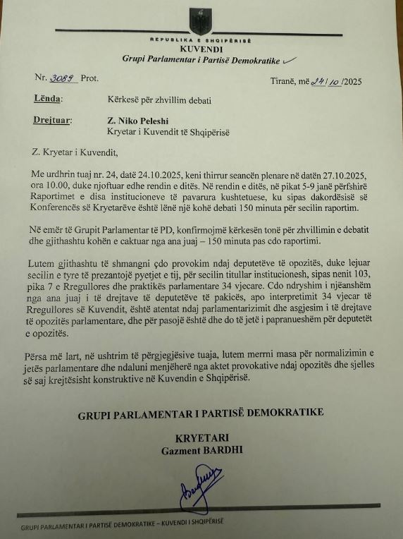 Teksa ditën e hënë (27 tetor) në orën 10:00 pritet që të mbahet seanca e radhës plenare në Kuvend ku do të raportojnë drejtuesit e institucioneve të pavarura, kreu i Grupit Parlamentar të PD-së Gazment Bardhi i ka kërkuar kryeparlamentarit Niko Peleshit që të shmangë provokimin ndaj deputetëve të opozitës.