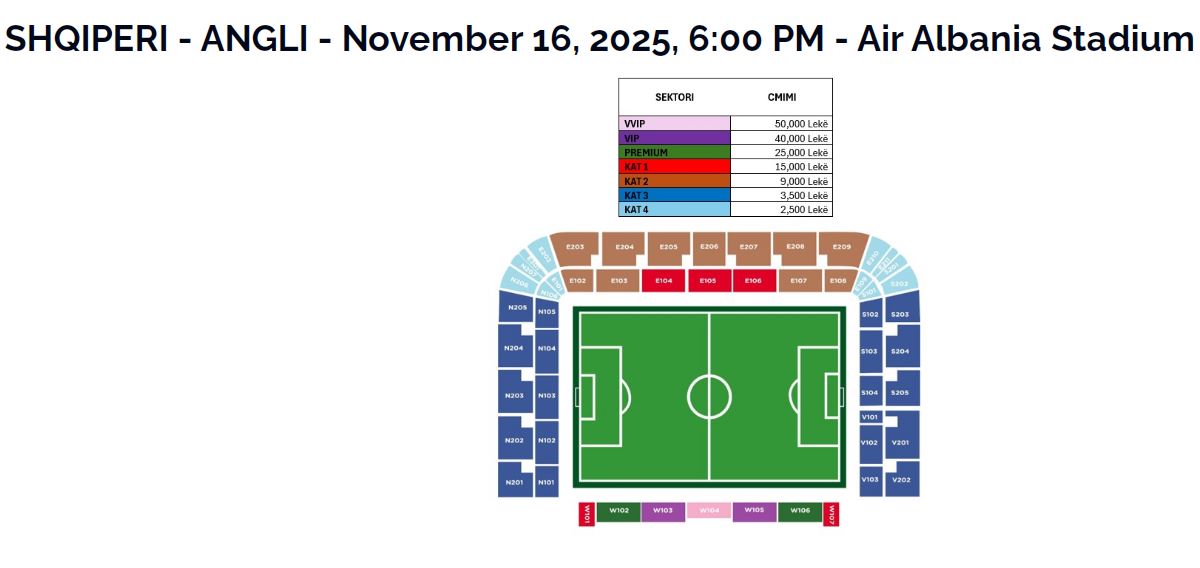 Bie në sy se pjesa më e madhe e sektorëve në stadium kanë çmime të rritura për duelin me Anglinë. Një pjesë e vogël e tribunave më të largëta kushtojnë 2500 lekë, teksa pas porte një biletë kushton 3500 lekë. Karshia, pra pjesa përballë që është më e preferuar kushton 9000 - 15000 lekë. Ndërkohë që për të ndjekur Kombëtaren nga tribuna VIP duhet të paguash mes 15000 - 50000 lekë.