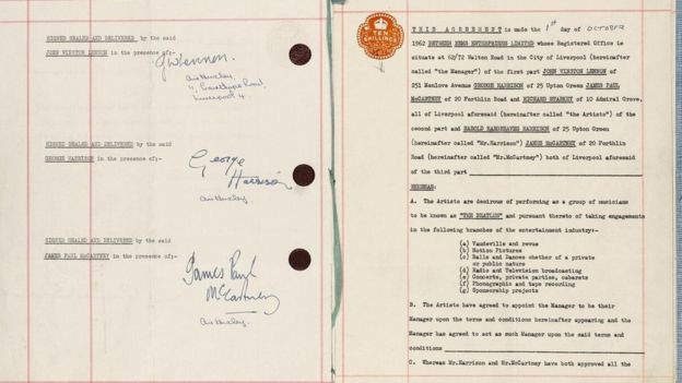 Kontrata origjinale e firmosur nga Beatles dhe menaxheri i tyre Brian Epstein, është shitur në ankandin Sotheby, për 365,000 paund. Dokumenti që daton nga viti 1962 thuhet të jetë një nga kontratat më të rëndësishme në muzikë, që ka shënuar fillimin e famës ndërkombëtare të grupit.