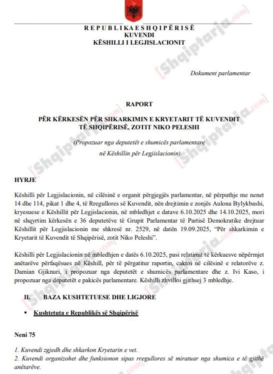 Report Tv ka siguruar raporton e Partisë Socialsite për nismën për shkarkimin e kryetarit të Kuvendit, Niko Peleshi. Në raportin e PS thuhet se nuk provohet asnjë shkelje nga ato që pretendon PD.