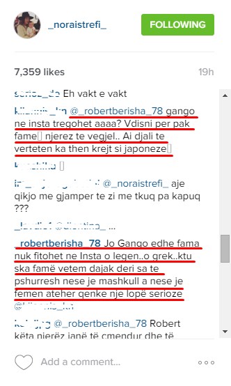 Robertit që duket se i ka ardhur në majë të hundës me komentet negative për partneren e tij, mes të tjerash i tha: "Nëse e ke jetën të keqe, s'ka nevojë të hysh në Instagram e të komentosh kështu...bëhu djalë i mirë se ti thyej eshtrat".
