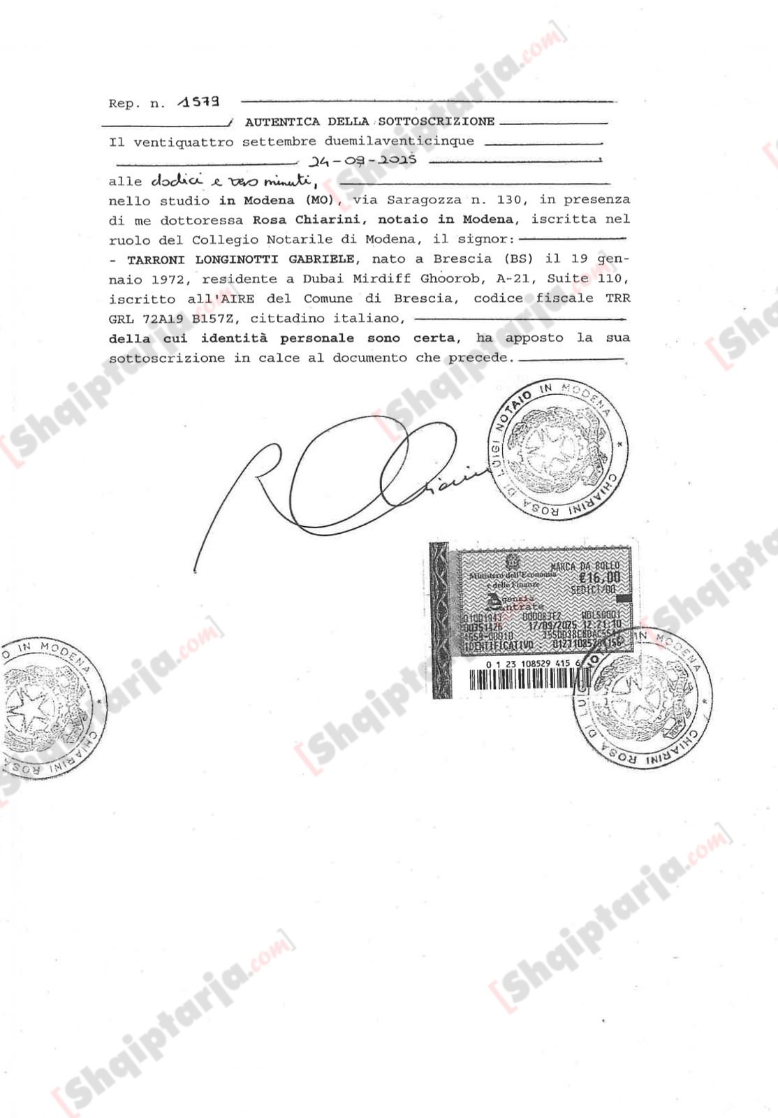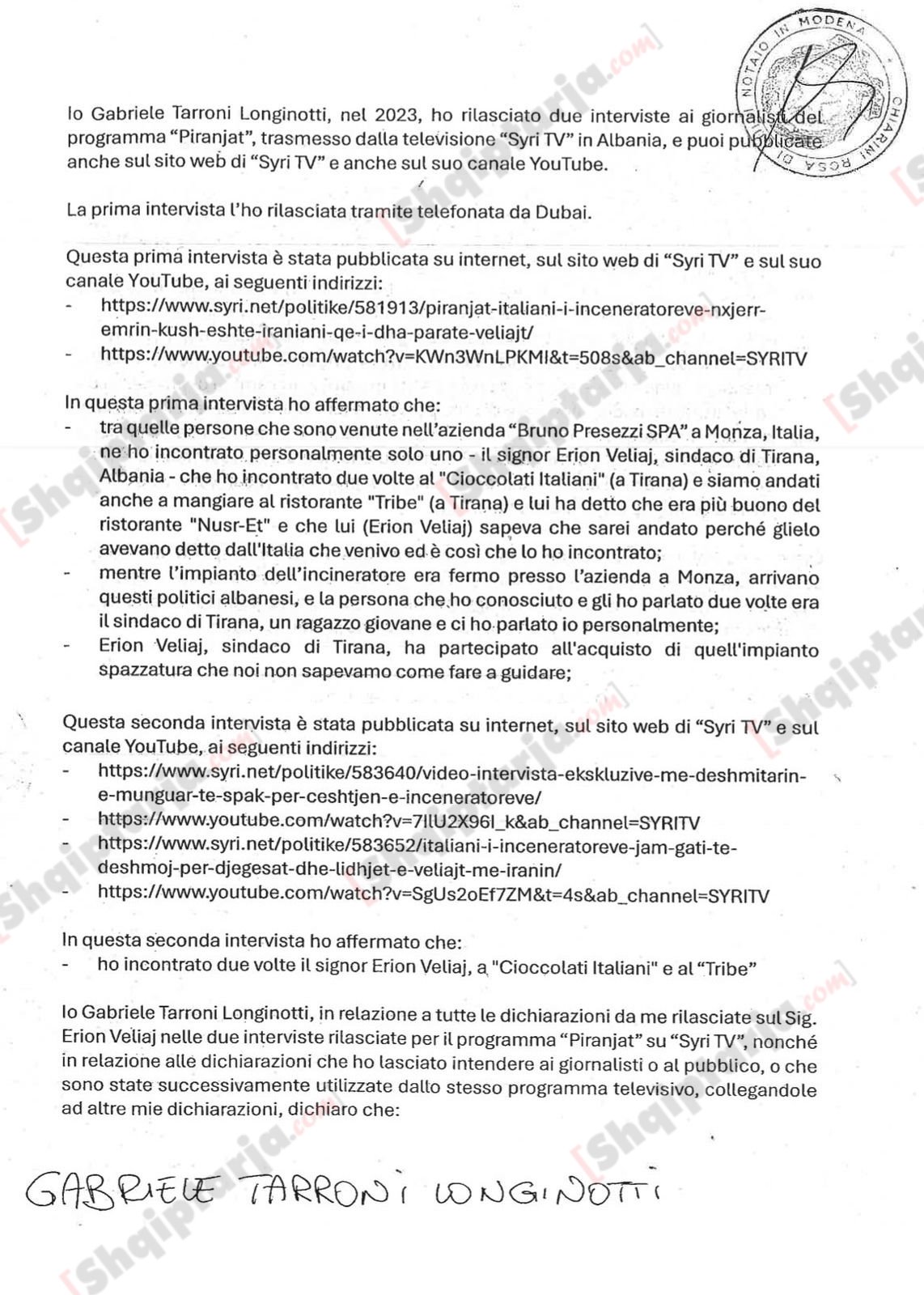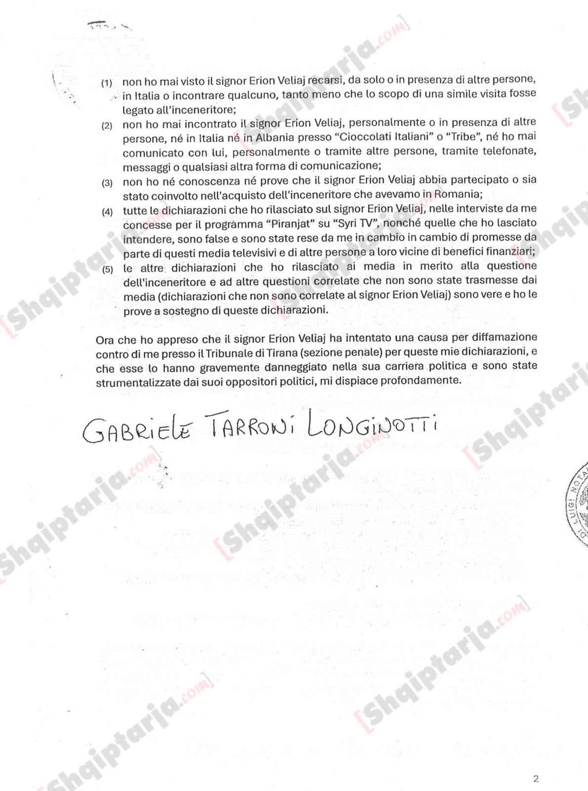 Deklarata noteriale e nënshkruar nga Gabriele Tarroni Longinotti në shtator 2025, ku pranon se shpifi për Veliajn