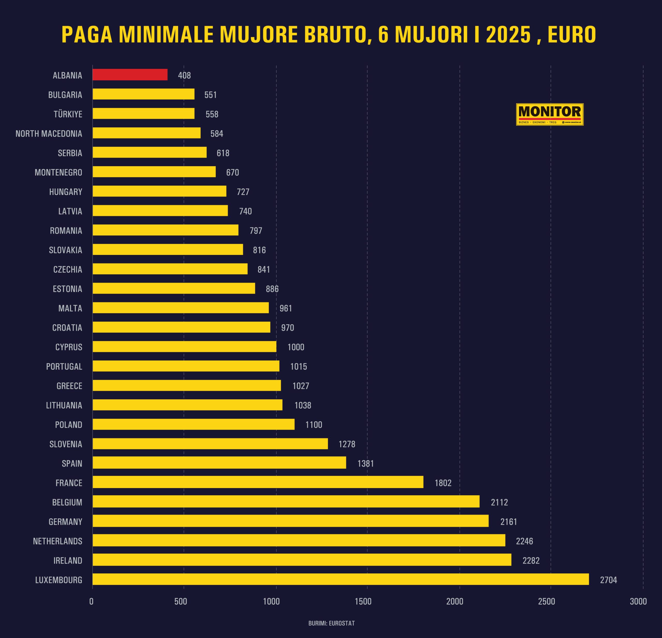 Në Bashkimin Europian, sipas të dhënave të Eurostat, janë 22 shtete që kanë paga minimale. Niveli më i lartë është në Luksemburg, me 2700 euro/muaj. Gjermania, një destinacion i preferuar për shqiptarët për të punuar, renditet e katërta, ku paga më e ulët mujore bruto është 2161 euro. Paga më e ulët minimale në BE është në Bullgari me 551 euro në muaj. Në Turqi niveli është 558 euro./Monitor