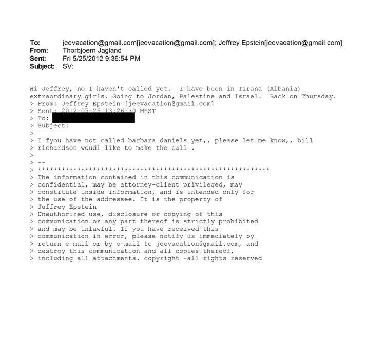 “Jeffrey, jo, nuk e kam telefonuar ende. Kam qenë në Tiranë, vajza të jashtëzakonshme ”, shkruante Jagland gjithashtu ish-kryeministër i Norvegjisë, në një pjesë të e-mailit dërguar Epstein, në të cilin siç ai i kthen përgjigje më pas, kuptohet se duhej që të kishte telefonuar një personazh me emrin “Barbara Daniels”. Nëse nuk e ke telefonuar ende i përgjigjet Epstein, atëherë Bill Richardson, do e marrë. Ky i fundit ishte politikan dhe diplomat amerikan, çka flet edhe një herë për përfshirjen e zyrtarë të lartë në dosjen e bërë publike Epstein.