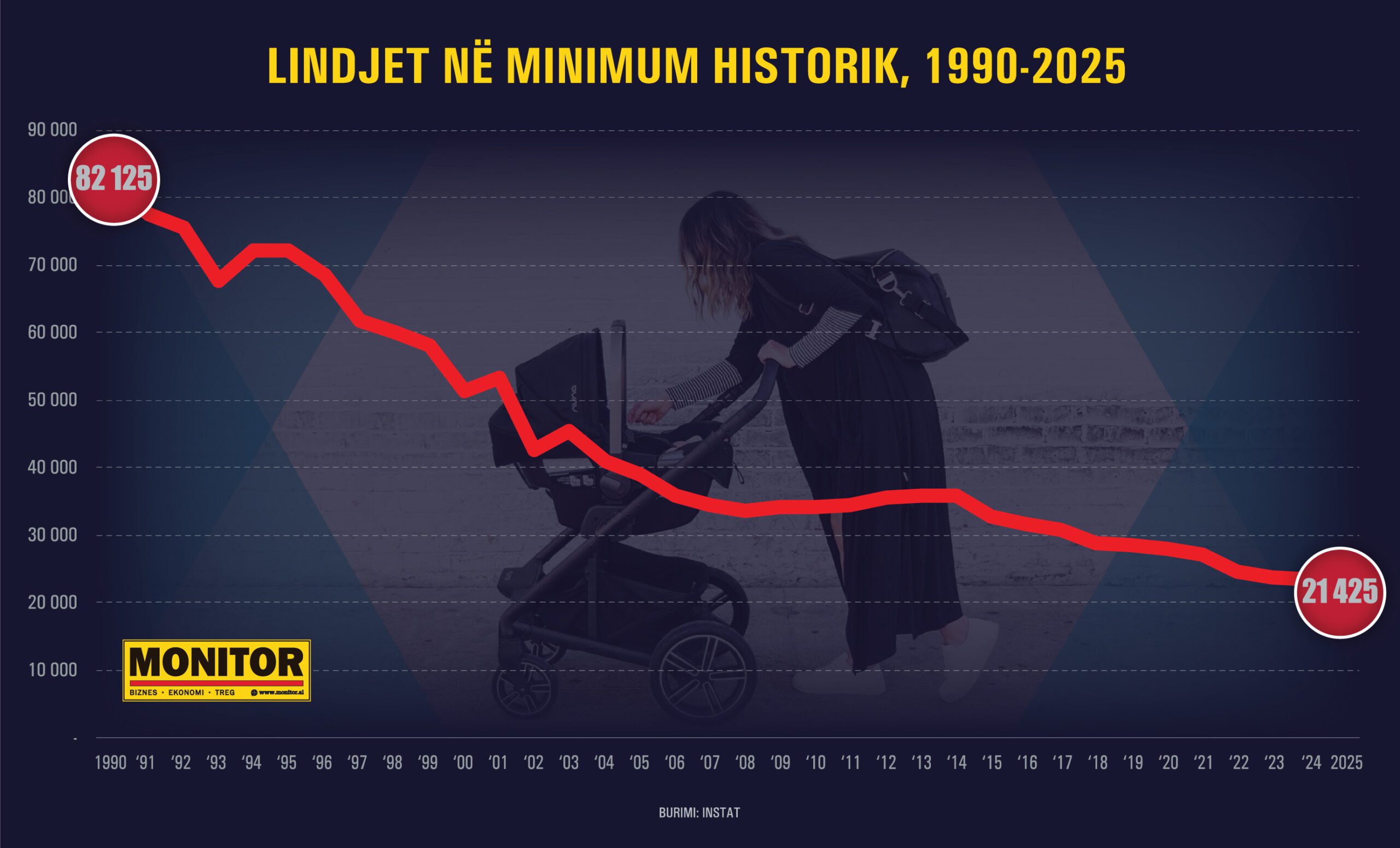 Shqipëria po hyn me shpejtësi në një fazë të re të tkurrjes demografike, ku viti 2025 ka konfirmuar këtë fenomen në shkallë vendi. Sipas të dhënave zyrtare, numri total i lindjeve ka zbritur në 21,425 në 2025, duke shënuar një rënie prej 8.1% krahasuar me 2024.