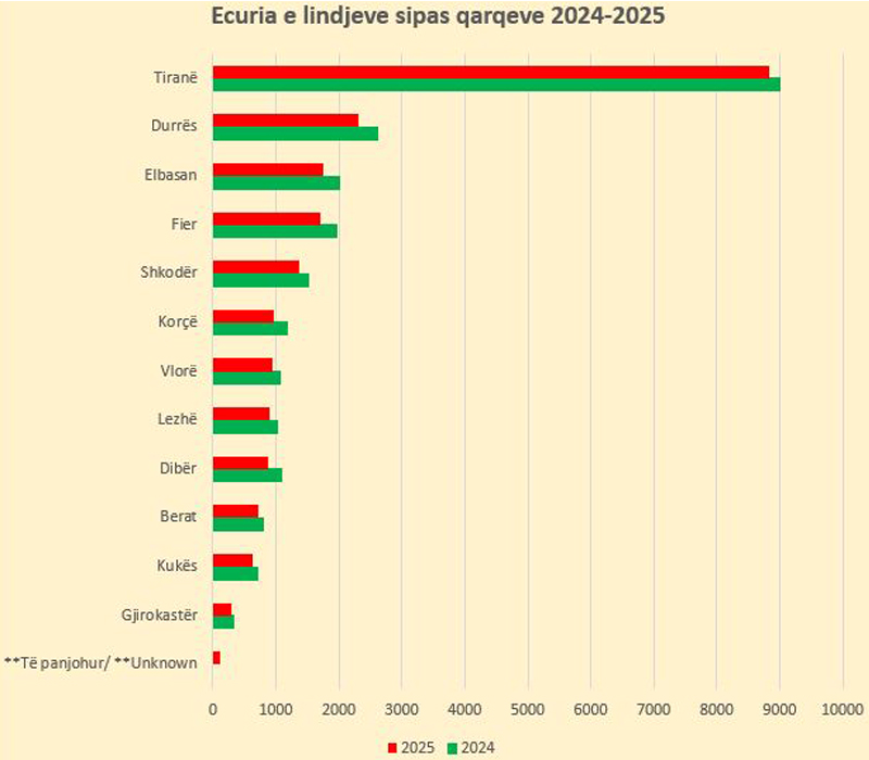 Goditjen më të rëndë e ka pësuar qarku i Dibrës, i cili kryeson listën me rënien më të madhe në rang kombëtar prej 20.4%, duke zbritur nga 1,095 lindje në 2024 në vetëm 872 në 2025. Pas saj vjen Korça, një qark që po përballet me një tkurrje drastike prej 18.5%, duke regjistruar 218 lindje më pak se në vitin 2024. Këto shifra sugjerojnë një zbrazje të vazhdueshme të këtyre rajoneve nga mosha riprodhuese, duke vënë në pikëpyetje qëndrueshmërinë sociale në afatgjatë.