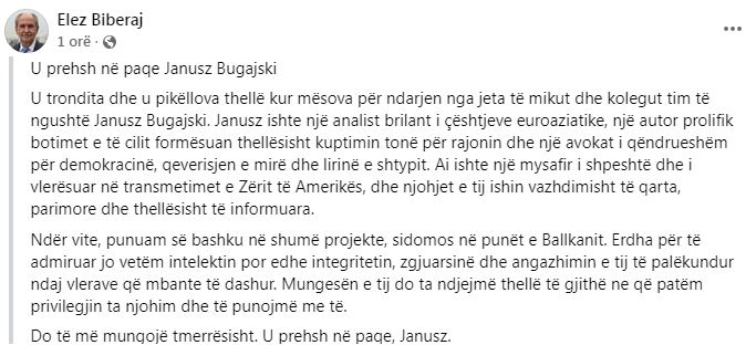 “Jam i tronditur dhe thellësisht i trishtuar kur mësova për ndarjen nga jeta të mikut dhe kolegut tim të ngushtë, Janusz Bugajski. Ai ishte një analist i shkëlqyer i çështjeve euroaziatike, autor i shumë veprave që ndikuan ndjeshëm në kuptimin tonë të rajonit dhe një mbrojtës i vendosur i demokracisë, qeverisjes së mirë dhe lirisë së shtypit “, shkroi Biberaj.