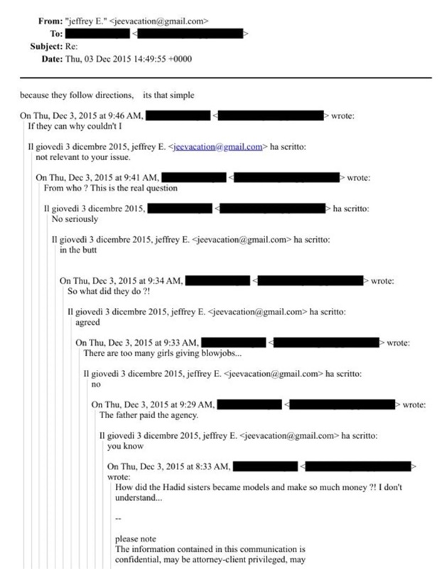 Epstein përgjigjet në mënyrë enigmatike: “Ti e di.” Marrësi hamendëson: “Babai i tyre pagoi agjencinë”. Mohamed Hadid, është ndërtues i pasurive luksoze të paluajtshme, ndërsa nëna e tyre, Yolanda Hadid, është ish-modele dhe personalitet televiziv.