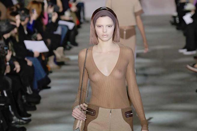 Edhe koleksioni pranverë 2015 i dizenjuesit Tom Ford ka fustane me gjoksin zbuluar të fshehur modestisht vetëm me disa gurë mbi copën transparente.