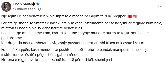 'Një agim i ri për Venezuelën, një shpresë e madhe për agim të ri në Shqipëri Për ata që thonë se Shtetet e Bashkuara nuk kanë instrumente për të ndryshuar regjime kriminale, mjafton t’i hedhin një sy gangsterit të Venezuelës. Regjimet që mbahen me krim, korrupsion dhe shtypje mund të duken të forta, por janë të përkohshme.Kur drejtësia ndërkombëtare lëviz, asnjë pushtet i ndërtuar mbi frikën nuk është i sigurt.Edhe në Shqipëri, kush mendon se pushteti i mbështetur te bandat, manipulimi dhe kapja e institucioneve është i përjetshëm, gabon rëndë.Historia e regjimeve kriminale ka një fund të përbashkët: shembjen!', shkruan Salianji