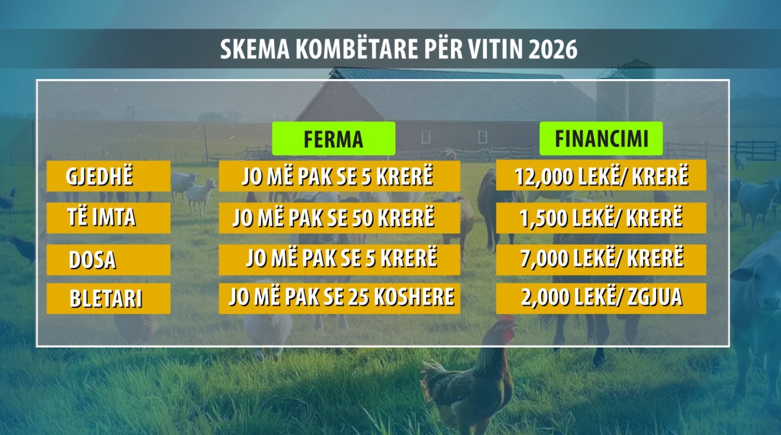 Me skemën e re qeveria mbështet me 10 mijë lekë çdo krerë lope për tufa jo më të vogla se 5 bagëti, dhe jep 1500 lekë për të imtat për tufa jo më të vogla se 50 krerë. Për herë të parë financimi për dosat në 7 mijë lekë për krerë, kush ka tufë jo më pak se 5 krerë. Kurse për bletarinë, jepet 20 mijë lekë për zgjua, për ferma me jo më pak se 25 koshere.