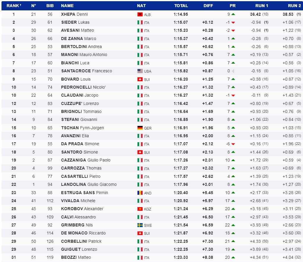 Me kohën 1 minutë, 14 sekonda dhe 95 të qindtat pas dy lëshimeve, Denni ishte 12 të qindtat më shpejt se vendi i dytë që u sigurua nga italiani Lukas Sieder. Në vendin e tretë një tjetër italian, Matteo Avesami.