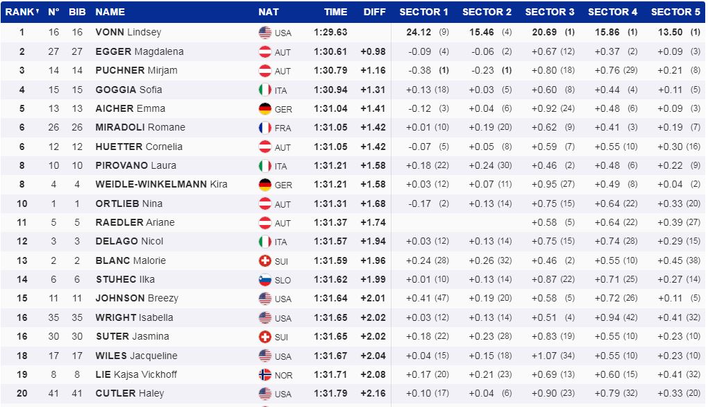 Në pistën e Saint Moritz në Zvicër, amerikania veterane e ndali kronometrin në 1 minutë, 29 sekonda e 63 të qindtat, thuajse një sekondë para austriakes Magdalena Egger dhe bashkëkombases së saj, Mirjam Puchner.