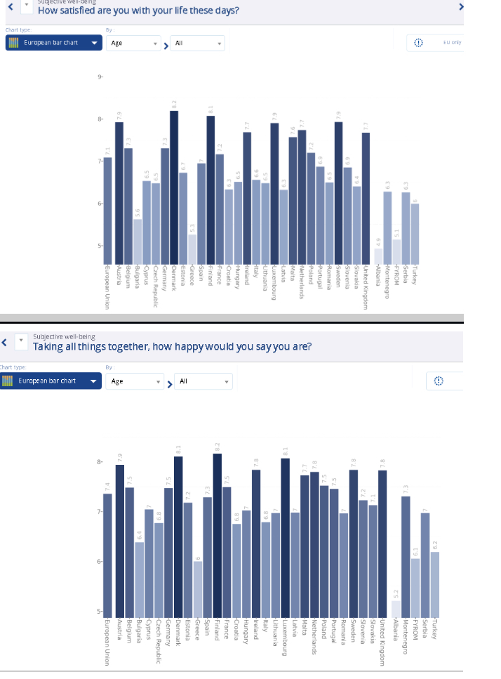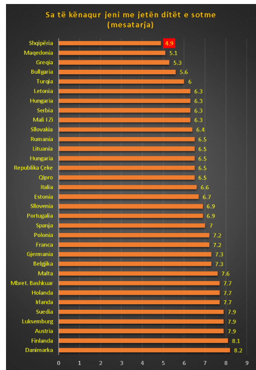 Për pyetjen “Sa të kënaqur jeni ju me jetën tuaj ditët e sotme”, për të gjitha moshat dhe gjinitë, Shqipëria ka një mesatare prej 4.9 pikë, që është më e ulëta në Europë. Pas Shqipërisë renditen Maqedonia me 5.1 pikë, Greqia me 5.3 pikë dhe Bullgaria me 5.6 pikë (shih grafikun).