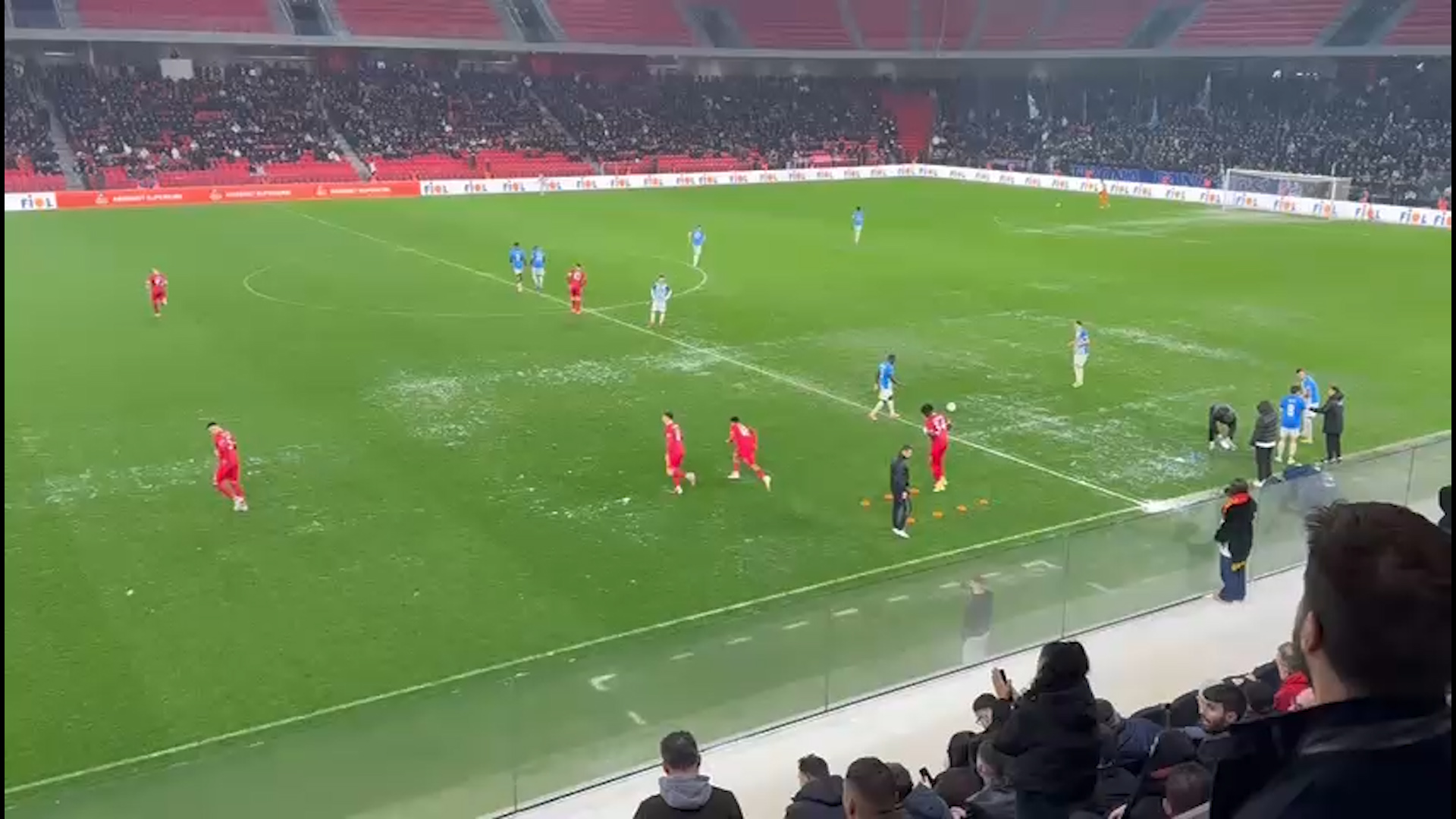 Vonon me 15 minuta nisja e pjesës së dytë të derbit për shkak të reshjeve të dendura të shiut në 'Air Albania'. Arbitri Juxhin Xhaja i shoqëruar nga kapitenët Skuka dhe Bekaj kanë inspektuar fushën, me Xhajën që ka hedhur topin në disa pjesë të fushës. Bashkarisht është vendosur që ndeshja të fillojë edhe pse në disa pjesë të fushës ka pellgje uji.