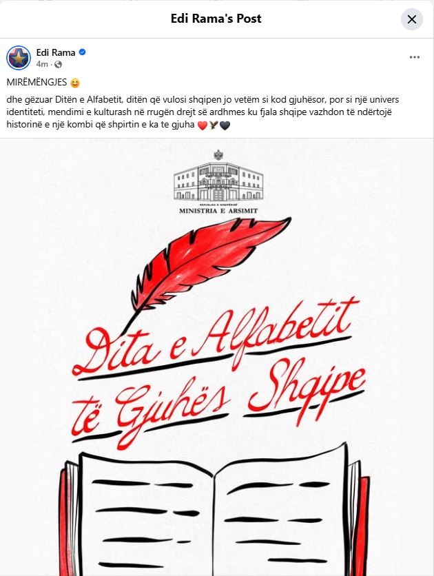 "Mirëmëngjes dhe gëzuar Ditën e Alfabetit, ditën që vulosi shqipen jo vetëm si kod gjuhësor, por si një univers identiteti, mendimi e kulturash në rrugën drejt së ardhmes ku fjala shqipe vazhdon të ndërtojë historinë e një kombi që shpirtin e ka te gjuha", ka shkruar kryeministri.