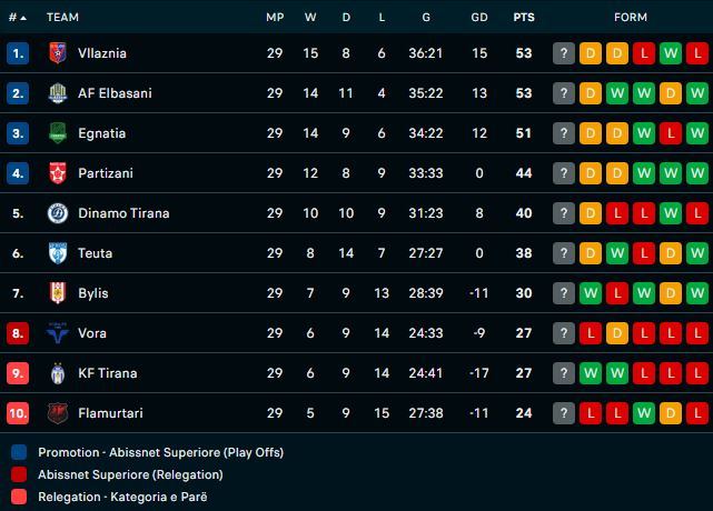 Pas 29 ndeshjeve të luajtura, Vllaznia, AF Elbasani, Egnatia dhe Partizani janë për momentin në 'Final 4', mini-turneun që në fund të sezonit të rregullt të lejon të garosh për titullin kampion. Në fund Vora, KF Tirana dhe Flamurtari.