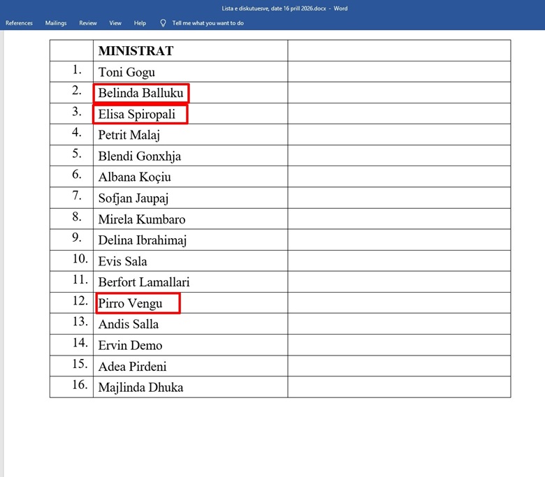 Veç Ballukut, vërehet se në listë janë edhe emrat e Elisa Spiropalit dhe Pirro Vengut në cilësinë e ministrave. Para ndryshimeve të fundit të kabinetit qeveritar, ata mbanin përkatësisht rolet si ministre e Jashtme dhe ministër i Mbrojtjes.