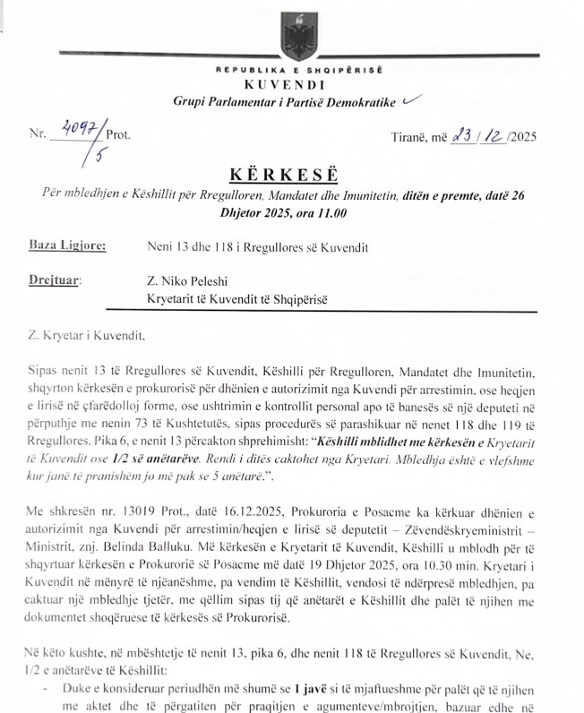 Pesë anëtarët demokratë të Këshillit të Mandateve Gamzent Bardhi, Gent Strazimiri, Oerd Bylykbashi, Elda Hoti dhe Saimir Korreshi i janë drejtuar me shkresë kryetarit të Kvuendit Niko Peleshi ku kërkojnë mbledhjen ditën e nesërme të Këshillit të Imunitetit për shqyrtimin e krëkesës së SPAK për arrestimin e zv.kryeministres Belinda Balluku.