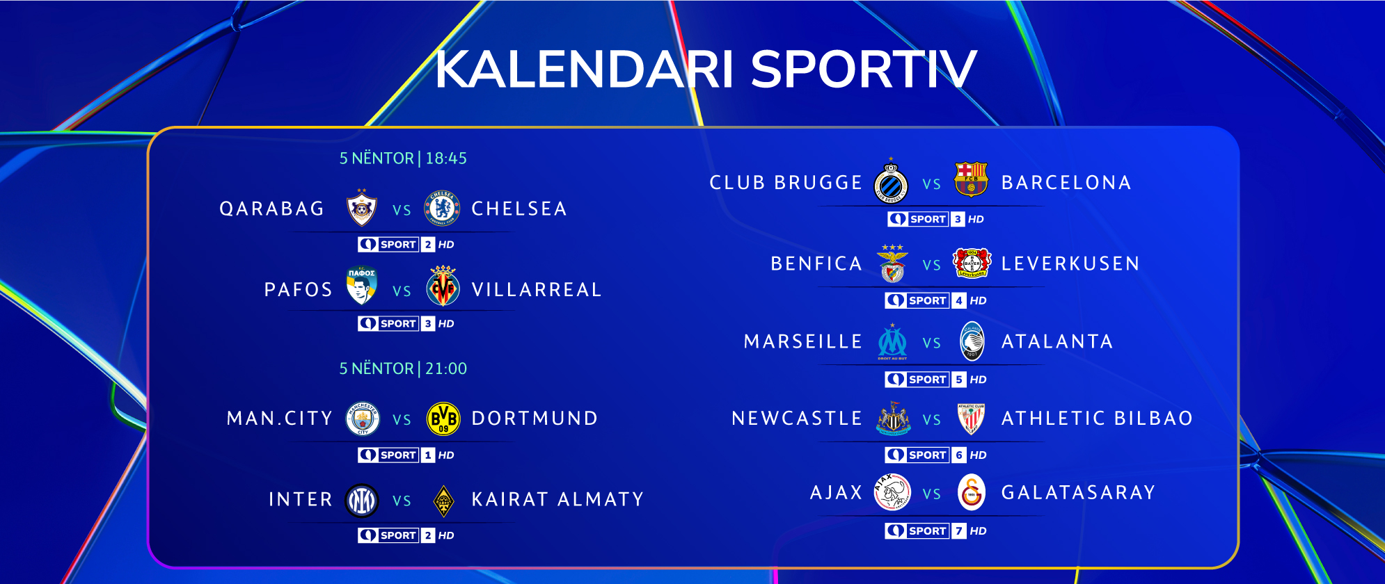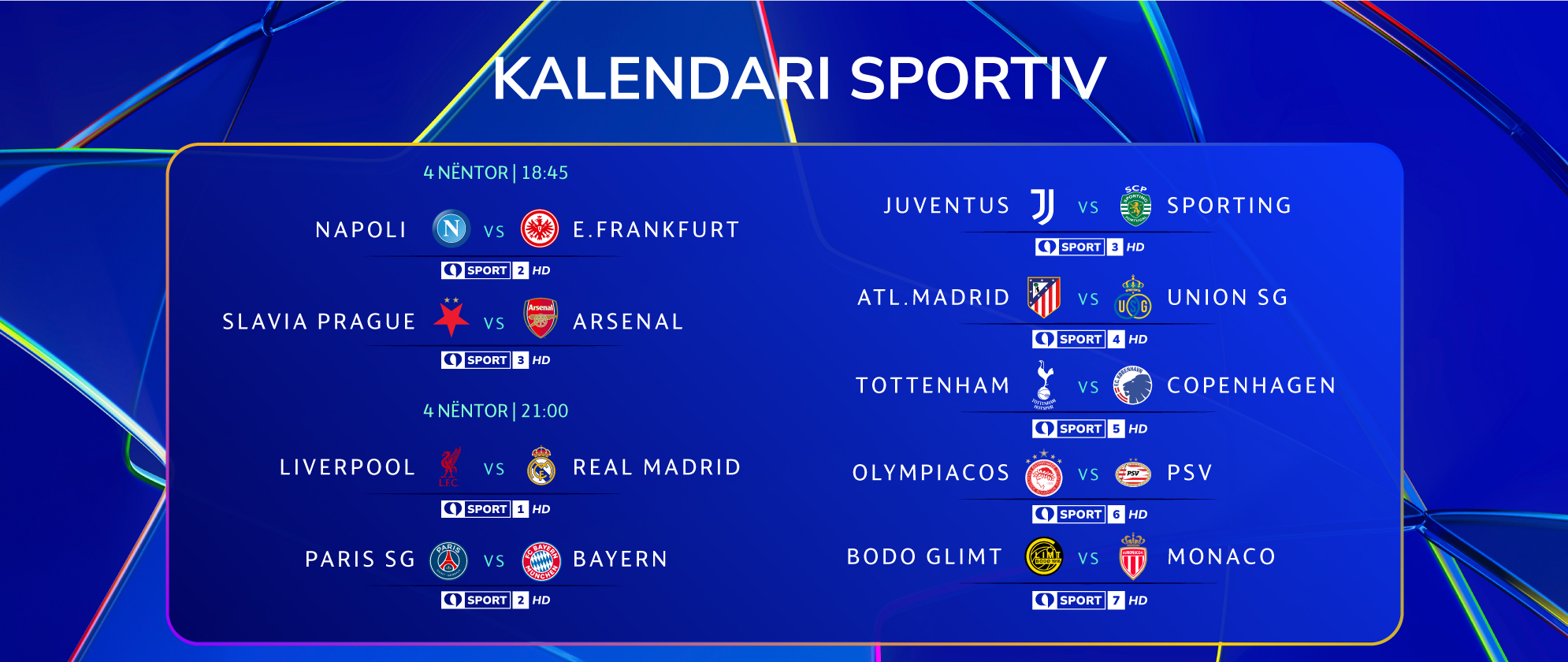 Në qiellin e Evropës është koha që yjet të shndrijnë sërish. Mesjava në TRING SPORT dhuron emocionet e futbollit të yjeve në kompeticion më të rëndësishëm botëror, Ligën e Kampionëve. Mbrëmjet CHAMPIONS janë një përvojë fenomenale për të gjithë tifozët në 8 kanalet sportive të platformës TRING, si një maratonë e pakrahasueshme 18 ndeshjesh që çdo raund të Fazës së Ligës përplasin të mëdhenjtë e Evropës.