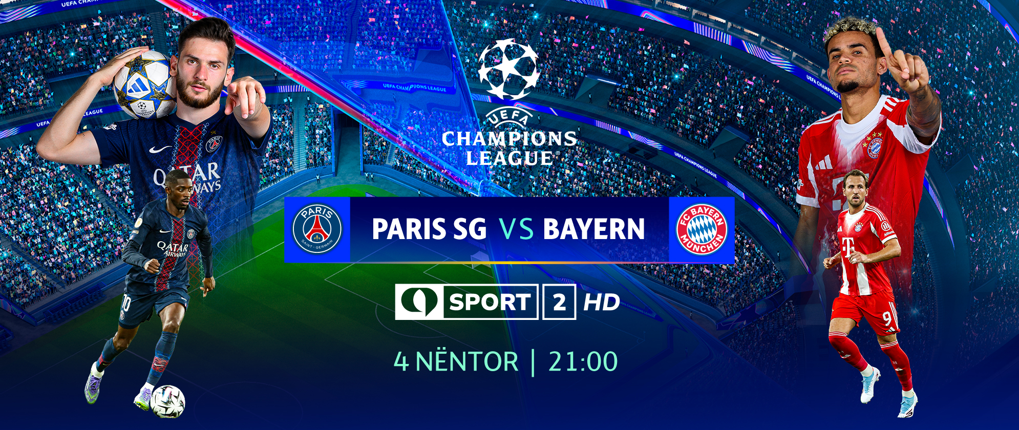 Ndërkohë, në Tring Sport 2 një tjetër superduel, padiskutim më i forti i këtij raundi, pasi në fushë zbresin dy skuadrat më të forta evropiane të momentit. Parizienët, kampionët në fuqi presin në shtëpi artilerinë e rëndë bavareze në një duel ndëryjor. PSG dhe Bayern, dy skuadrat kryesuese të sezonit në betejën për dominim.