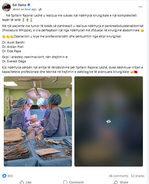 “Kjo ndërhyrje përbën një arritje të rëndësishme për Spitalin Rajonal Lezhë, duke dëshmuar rritjen e kapaciteteve profesionale dhe teknike në trajtimin e patologjive të avancuara kirurgjikale”, u shpreh Rama.