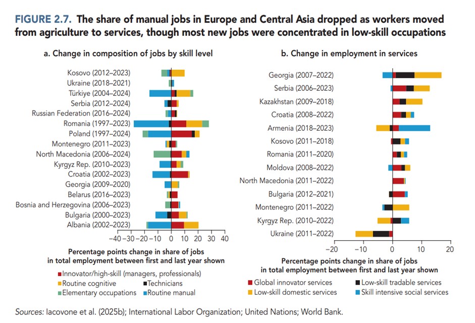Shqipëria, Bosnja dhe Bullgaria ndodhen në grupin e vendeve që kanë përjetuar rënie të fortë të punëve rutinë-manuale, por pa e kompensuar këtë humbje me shtim të punëve me aftësi të larta.