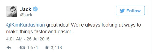 Më pas bukuroshja e njohur për hiret e saj është ka marrë një përgjigje pozitive nga Jack Dorsey, një nga themeluesit e këtij rrjeti social. “ Ide shumë e mirë. Ne jemi gjithnjë në kërkim të mënyrave për ti bërë gjërat më shpejt dhe më thjeshtë”,-ka shkruar Dorsey.