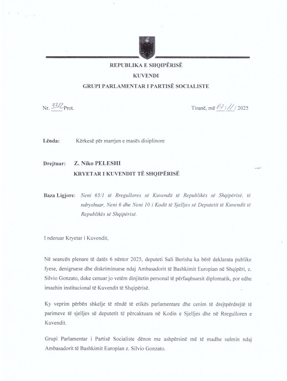 PS kërkon ndëshkimin e Sali Berishës për sulmet e një dite më parë ndaj ambasadorit të BE-së, Silvio Gonzato, lidhur me projektligjin për barazinë gjinore. Në kërkesën drejtuar Sekretariatit të Etikës, socialistët i referohen nenit 65/1, të Rregullores “Përjashtim nga pjesëmarrja në komisione dhe/ose në seancë plenare deri në 10 ditë, 30 ditë ose 60 ditë.”