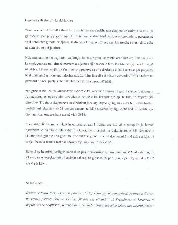 Berisha tha brenda dhe jashtë Kuvendit se Gonzato nuk mund t’i impononte shoqërisë shqiptare bindjet e veta personale. Deklarata e tij solli edhe reagimin e Komisioneres së BE për Zgjerim, Marta Kos, e cila tha se linjëzimi i legjislativit të Shqipërisë me këto parime të BE, është pjesë e procesit të pranimit në Union. U pasua më pas edhe me reagimin e kryeministrit Edi Rama, i cili kërkoi ndjesë për sjelljen e kundërshtarit të tij dhe përdorimin e emrit të ambasadorit për një qëllim të ulët.