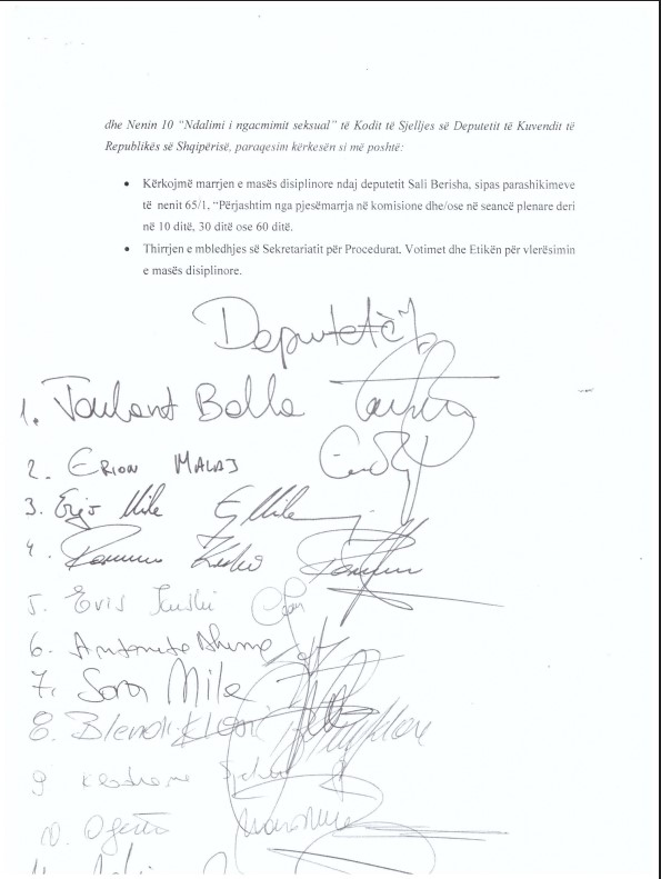 “Kërkojmë marrjen e masës disiplinore ndaj deputetit Sali Berisha, sipas parashikimeve të nenit 65/1, Përjashtim nga pjesëmarrja ne komisione dhe/ose në seancë plenare deri në 10 ditë, 30 ditë ose 60 ditë.”, thuhet në kërkesë.