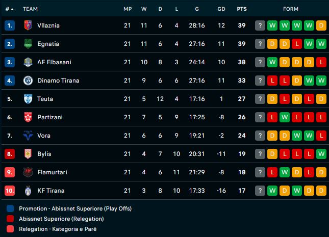 Pas raundit të 21-të, Superliga bashkëkryesohet nga Vllaznia dhe Egnatia me nga 39 pikë, por me shkodranët në krye për shkak të ndeshjeve direkte. Ndjekin AF Elbasani dhe Dinamo. Në fund Bylisi, Flamurtari dhe Tiranë, por zona e ftohtë ka filluar të ketë një garë shumë interesante.