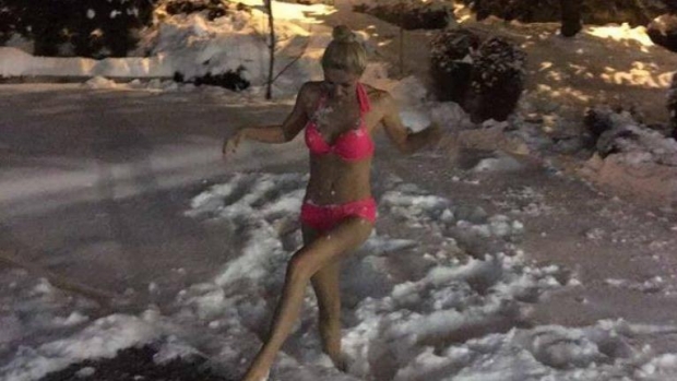 Bukuroshja nga Kosova duket se nuk i ka problem temperaturat e ulëta pasi ka dalë në borë me rroba plazhi.