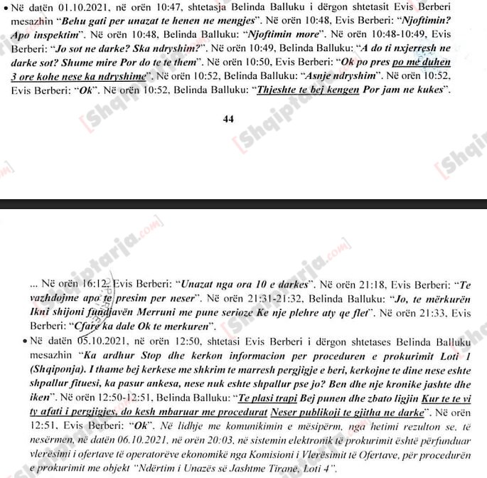 Në datën 05.10.2021, në orën 12:50, shtetasi Evis Berberi i dërgon shtetases Belinda Balluku mesazhin "Ka ardhur Stop dhe kerkon informacion per proceduren e prokurimit Loti 1 (Shqiponja). I thame bej kerkese me shkrim te marresh pergjigje e beri,kerkojne te dine nese eshte shpallur fituesi, ka pasur ankesa, nese nuk eshte shpallur pse jo? Ben dhe nje kronike jashte dhe iken". Në orën 12:50-12:51, Belinda Balluku: "Te plasi trapi Bej punen dhe zbato ligjin Kur te te vi ty afati i pergjigjes, do kesh mbaruar me procedurat Neser publikoji te gjitha ne darke`.