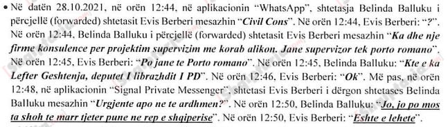 Në datën 28.10.2021, në orën 12:44, në aplikacionin "ËhatsApp", shtetasja Belinda Balluku i përcjellë (forëarded) shtetasit Evis Berberi mesazhin "Civil Cons". Në orën 12:44, Evis Berberi: "?". Në orën 12:44, Belinda Balluku i përcjellë (forëarded) shtetasit Evis Berberi mesazhin "Ka dhe nje firme konsulence per projektim supervizim me korab alikon. Jane supervizor tek porto romanо". Në orën 12:45, Evis Berberi: "Po jane te Porto romano". Në orën 12:45, Belinda Balluku: "Kte e ka Lefter Geshtenja, deputet I librazhdit I PD". Në orën 12:46, Evis Berberi: "Ok". Më pas, në orën 12:48, në aplikacionin "Signal Private Messenger", shtetasi Evis Berberi i dërgon shtetases Belinda Balluku mesazhin "Urgjente apo ne te ardhmen?". Në orën 12:50, Belinda Balluku: "Jo, jo po mos ta shoh te marr tjeter pune ne rep e shqiperise". Në orën 12:50, Evis Berberi: "Eshte e lehte".