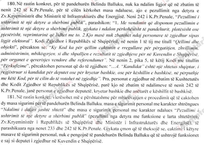 -Në rastin konkret, për të pandehurën Belinda Balluku, nuk ka ndalim ligjor që në zbatim të nenit 242 të K.Pr.Penale, për të cilën kërkohet masa ndaluese, ajo e pezullimit nga detyra е Zv.Kryeministrit dhe Ministrit të Infrastrukturës dhe Energjisë. Neni 242 i K.Pr.Penale, "Pezullimi i ushtrimit të një detyre a shërbimi publik", parashikon: "1. Me vendimin që disponon pezullimin e ushtrimit të një detyre a shërbimi publik, gjykata i ndalon përkohësisht të pandehurit, plotësisht ose pjesërisht, veprimtarinë që lidhet me to. 2.Kjo masë nuk zbatohet ndaj personave të zgjedhur sipas ligjit elektoral". Kodi Zgjedhor i Republikës së Shqipërisë, në nenin 1 të tij me titull "Qëllimi dhe objektí, përcakton se: "Ky Kod ka për qëllim caktimin e rregullave për përgatitjen, zhvillimin, administrimin, mbikëqyrjen, si dhe shpalljen e rezultatit të zgjedhjeve për në Kuvendin e Shqipërisë, për organet e qeverisjes vendore dhe referendumet". Në nenin 2, pika 5, të këtij Kodi me titullin "Përkufīzime", përcaktohen personat që do të zgjidhen: "...4. "Kandidat" është një shtetas shqiptar, i regjistruar si kandidat për deputet ose për kryetar bashkie, ose për këshillin e bashkisë, në përputhje me këtë Kod, për të cilin do të votohet në zgjedhje ". Pra, personat e zgjedhur në zbatim të Kushtetutës dhe Kodit Zgjedhor të Republikës së Shqipërisë, parë kjo në zbatim të ndalimeve të nenit 242 të K.Pr.Penale,janë personat e zgjedhur deputetë, kryetar bashkie dhe anëtarët e këshillit të bashkisë.