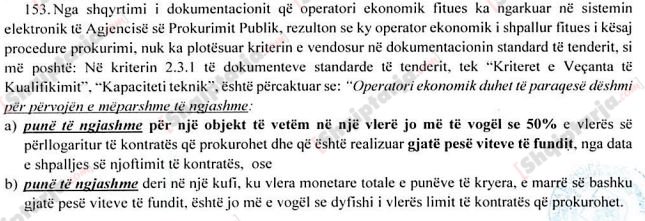 Nga shqyrtimi i dokumentacionit që operatori ekonomik fitues ka ngarkuar elektronik të Agjencisë së Prokurimit Publik, rezulton se ky operator ekonomik i shpallur fitues i kësaj procedure prokurimi, nuk ka plotësuar kriterin e vendosur në dokumentacionin standard të tenderit, si më poshtë: Në kriterin 2.3.1 të dokumenteve standarde të tenderit, tek "Kriteret e Veçanta të Kualifikimit", "Kapaciteti teknik", është përcaktuar se: "Operatori ekonomik duhet të paraqesë dëshmi për përvojën e mëparshme të ngjashme: a) punë të ngjashme për një objekt të vetëm në një vlerë jo më të vogël se 50% e vlerës së përllogaritur të kontratës që prokurohet dhe që është realizuar gjatë pesë viteve të fundit, nga data e shpalljes së njoftimit të kontratës, ose b) punë të ngjashme deri në një kufi, ku vlera monetare totale e punëve të kryera, e marrë së bashku gjatë pesë viteve të fundit, është jo më e vogël se dyfishi i vlerës limit të kontratës që prokurohet.