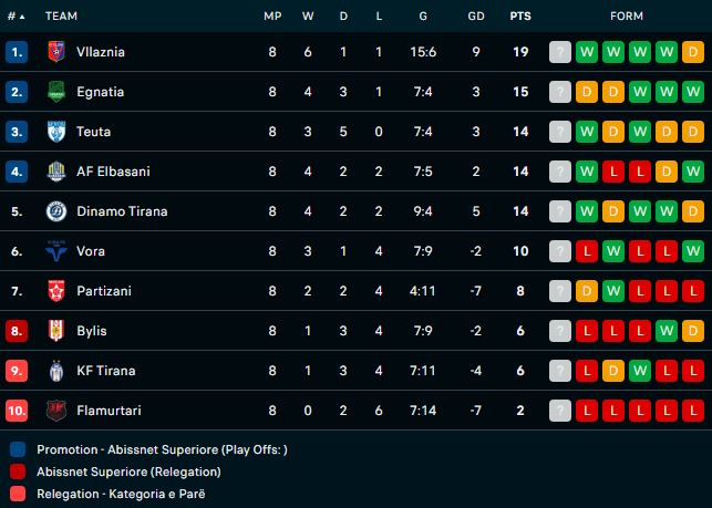 Në tetë raunde, Tirana ka vetëm një fitore dhe me gjashtë pikë mban vendin e parafundit, katër më shumë se Flamurtari. Nga ana tjetër, AF Elbasani me 14 pikë ndodhet në pozitën e katërt.