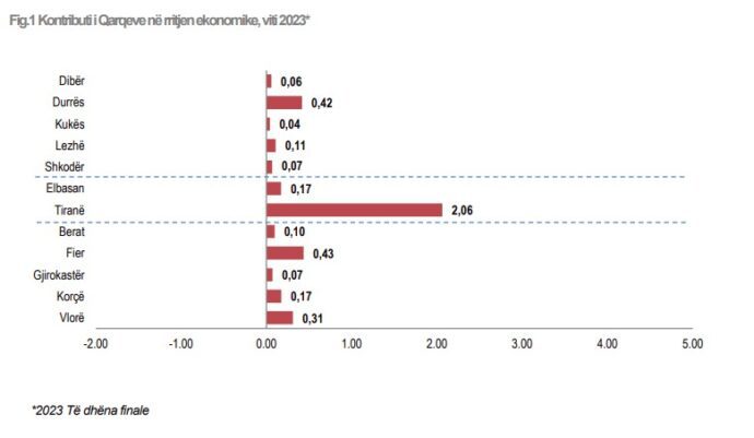 Kryeqyteti vijon të jetë motori kryesor i rritjes ekonomike, duke kontribuar me mbi 2 pikë përqindje në rritjen kombëtare, shumë më tepër se çdo qark tjetër. Vetëm Tirana gjeneroi mbi 43% të PBB-së së vendit dhe shënoi një rritje reale prej 4,7% në vitin 2023. Pas saj, qarku Fier kontribuoi me +0,43 pikë përqindje dhe Durrësi me +0,42.