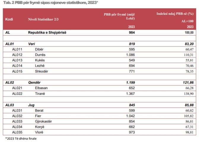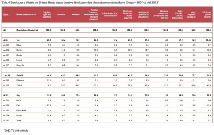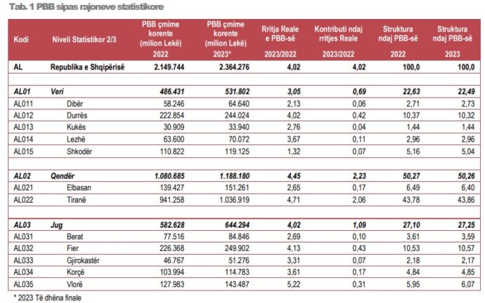Në total, PBB e Shqipërisë u vlerësua me 2,36 trilionë lekë në çmime korrente, me një rritje reale prej 4,02% krahasuar me 2022. Rreth gjysma e kësaj vlere, plot 50,3%, u krijua në rajonin Qendër – ku dominon ekonomia e Tiranës – ndërsa veriu kontribuoi me 22,5% dhe jugu me 27,2%.