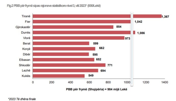 Në vitin 2023, niveli më i lartë i PBB-së për frymë sipas rajoneve statistikore në nivel 3 (Qark), në vitin 2023, u regjistrua në Qarkun Tiranë, me 1.367 mijë Lekë, duke u vlerësuar 38,90 % mbi mesataren e vendit.