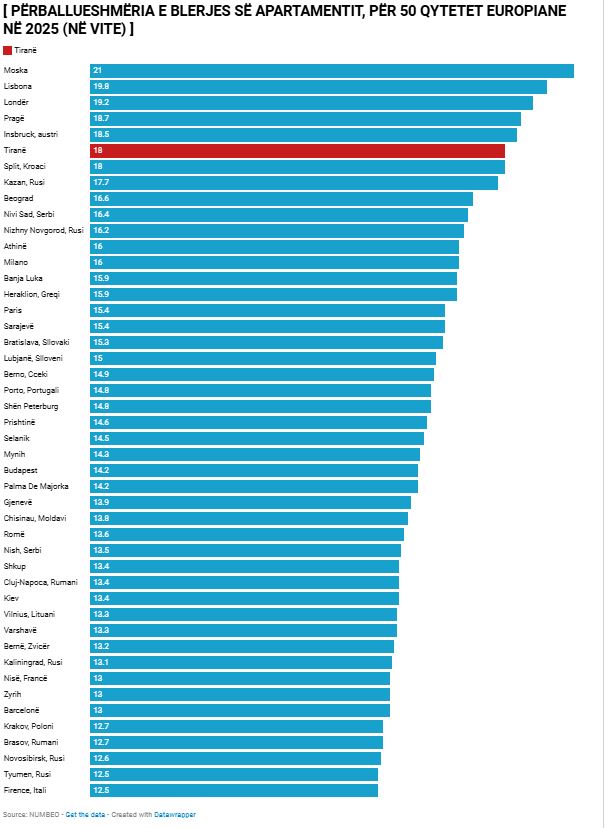 Tirana vazhdon të renditet ndër gjashtë qytetet më të shtrenjta në Europë për përballueshmërinë e blerjes së pronës, për shkak të rritjes së ndjeshme të çmimeve të apartamenteve dhe të ardhurave mesatare relativisht të ulëta.