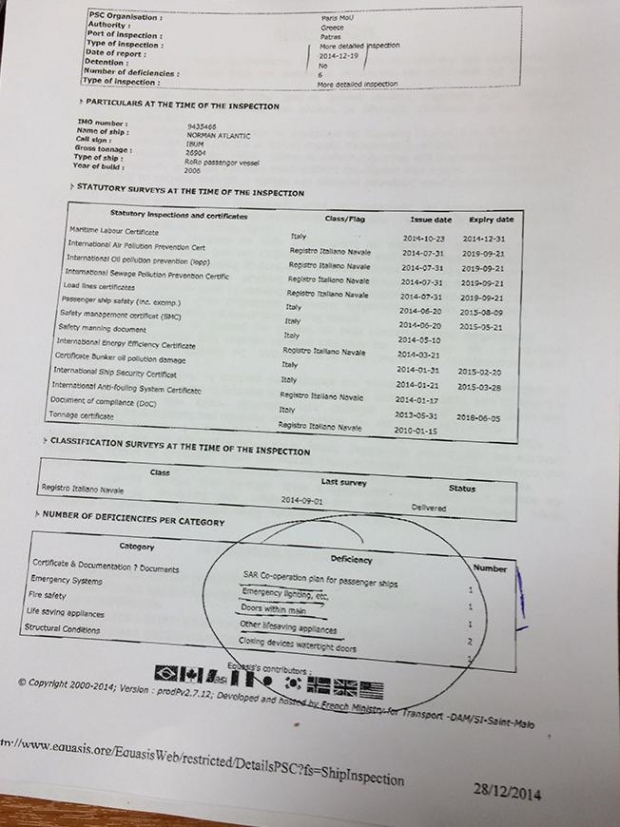 (Dokumenti i inspektimit për tragetin "Norman Atlantic")