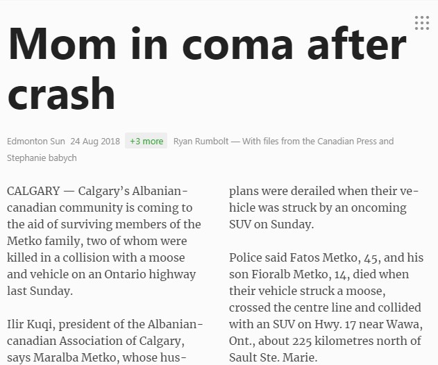 KANADA-Dy anëtarët e familjes Metko që mbetën të plagosur nga aksidenti ditën e diel në Ontario vijojnë që të jenë në spital. Sipas mediave kanadeze, Maralba Metko, shqiptarja që humbi bashkëshortin dhe djalin në aksident ndodhet në gjendje kome, ndërsa vajza Briana është jashtë rrezikut për jetën. Presidenti i Shoqatës Shqiptaro-Kanadeze në Calgary Ilir Kuqi pas vizitës në spital theksoi se vajza e ka kaluar rrezikun, ndërsa shtoi se nëna ndodhet në gjendje të rëndë.